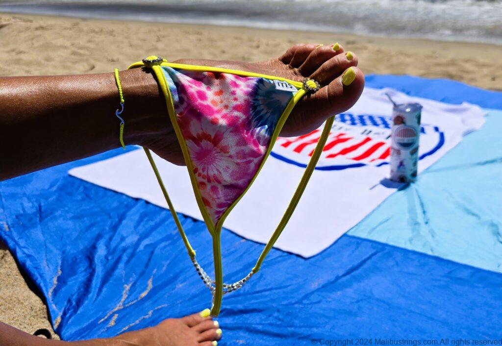 Here are a few beach pics in one of my favorite Malibu Strings bikinis, the solid Tie Dye No 5 with customized yellow trim. I love how bright and colorful it is and how it pops against my tan. I also have the Sheer Mesh version, which I’ll post separately, soon. Many thanks to Jenny, and my Malibu Strings family for always taking such great care of me!