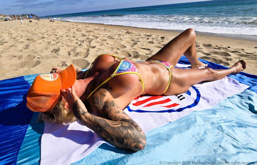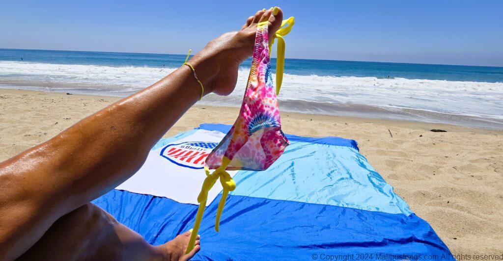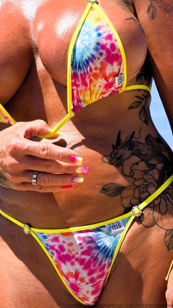 Here are a few beach pics in one of my favorite Malibu Strings bikinis, the solid Tie Dye No 5 with customized yellow trim. I love how bright and colorful it is and how it pops against my tan. I also have the Sheer Mesh version, which I’ll post separately, soon. Many thanks to Jenny, and my Malibu Strings family for always taking such great care of me!