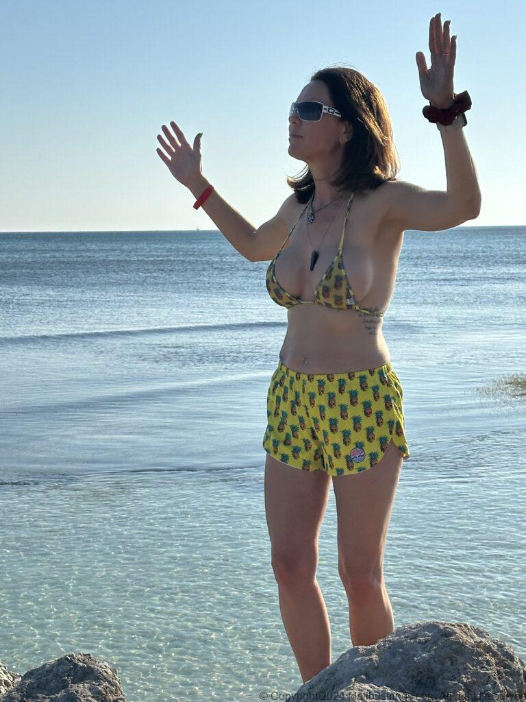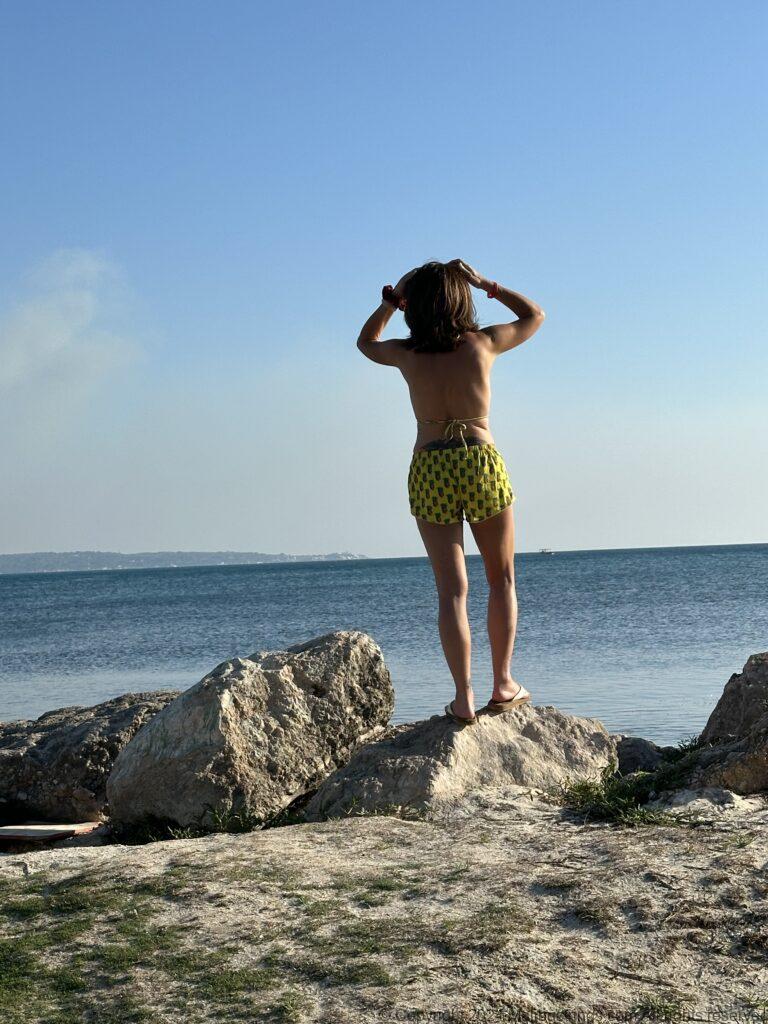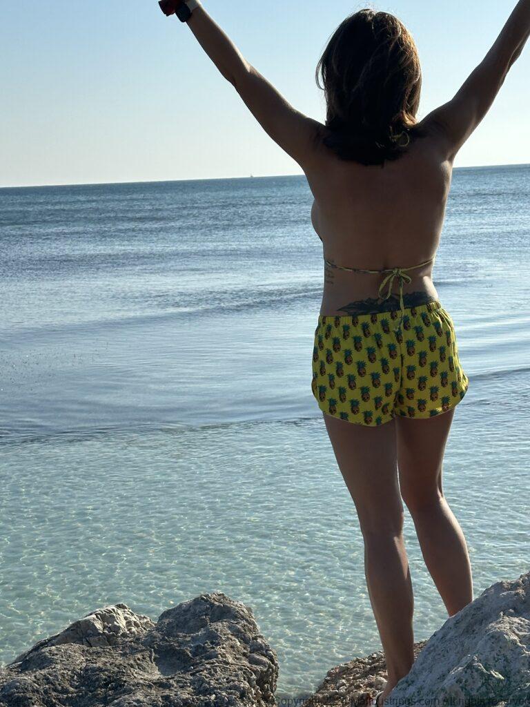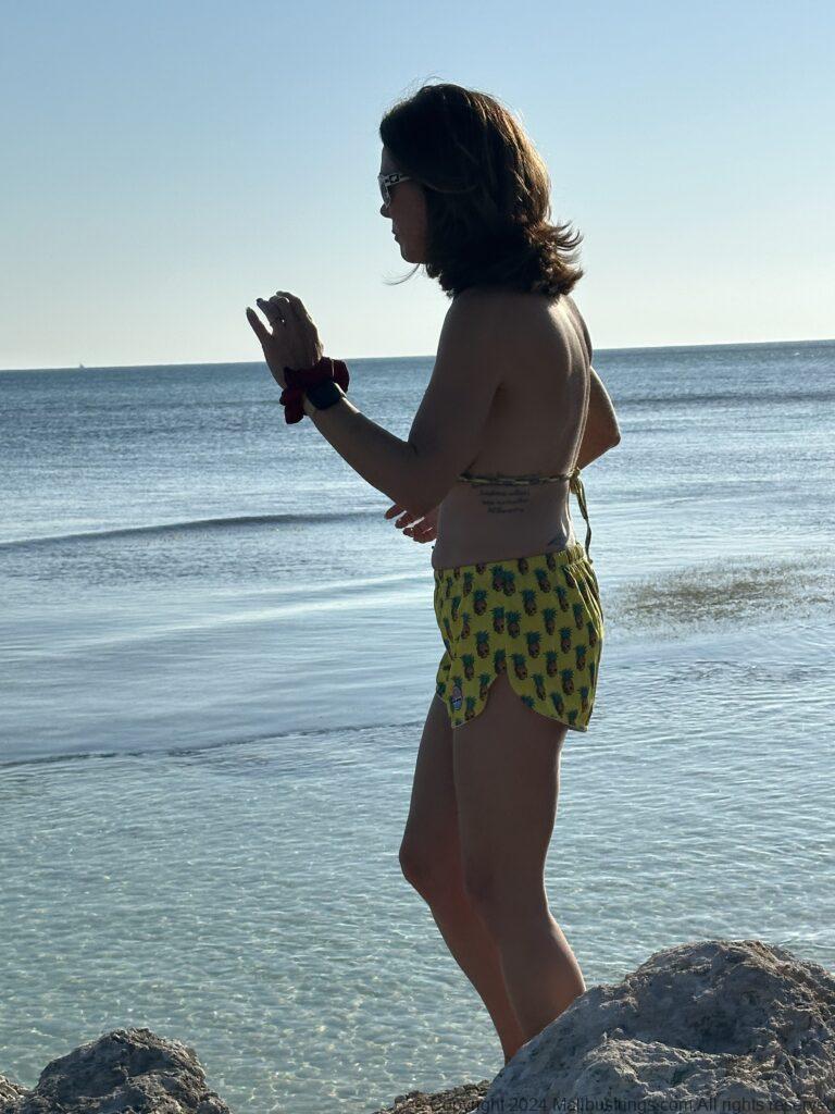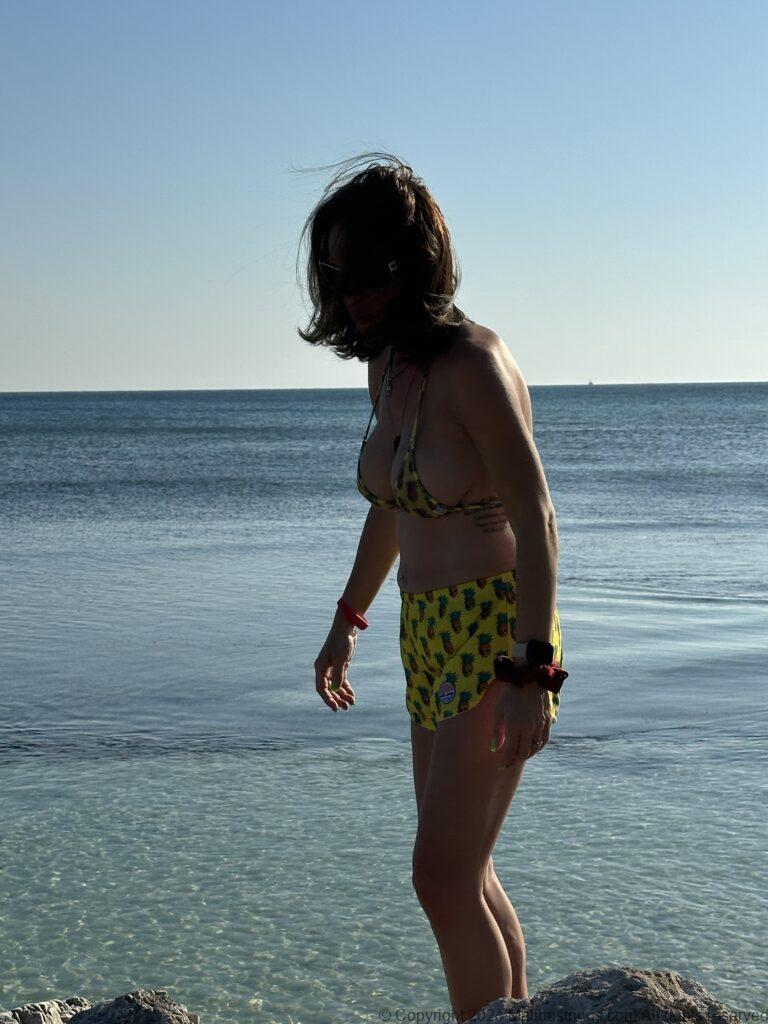 I was hanging out on the beach in Jamaica. There is mothing better than the tiny Pineapple Skull suit with matching running shorts. Fits right in with the vibe of the island.