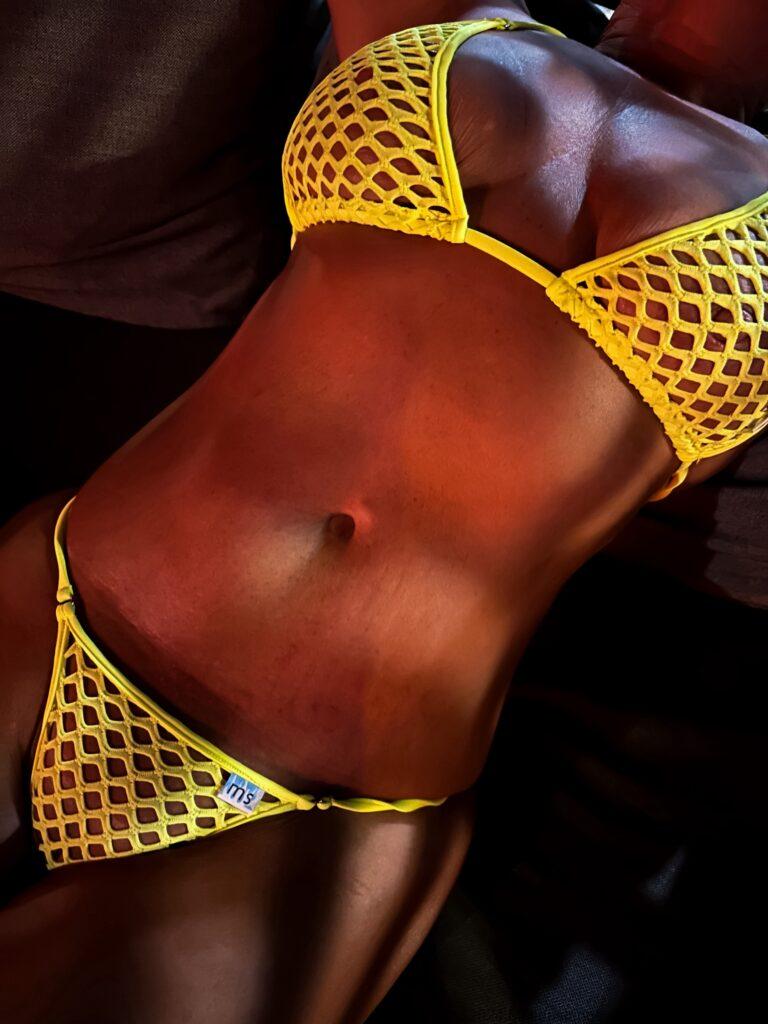 I’ve always been a bit modest regarding my photo shoots, usually utilizing a remote beach or a mid-week boat shoot to avoid being in risqué bikinis around people who aren’t likeminded so when we realized that the only people besides us left at the adults only hotel on Sunday night was four guys leftover from a bachelor party I can tell you that the tingle down below was so intense as I walked into the pool area wearing my super cute Yellow Fishnet bikini and instantly felt eight eyes on me! I asked from across the pool if they minded me getting a little work done and I received eager approval. My heart raced with every pose and movement and the naughty (yet gentlemanly) comments fueled my own enthusiasm to take a great shot. No, I did not end up in a gang-bang with four twenty-something guys, but let’s just say that I enjoyed the experience of six strangers’ hands exploring my body! (One of the guys was married so he just had a beer with my husband and they watched his friends enjoy getting to know my body!)