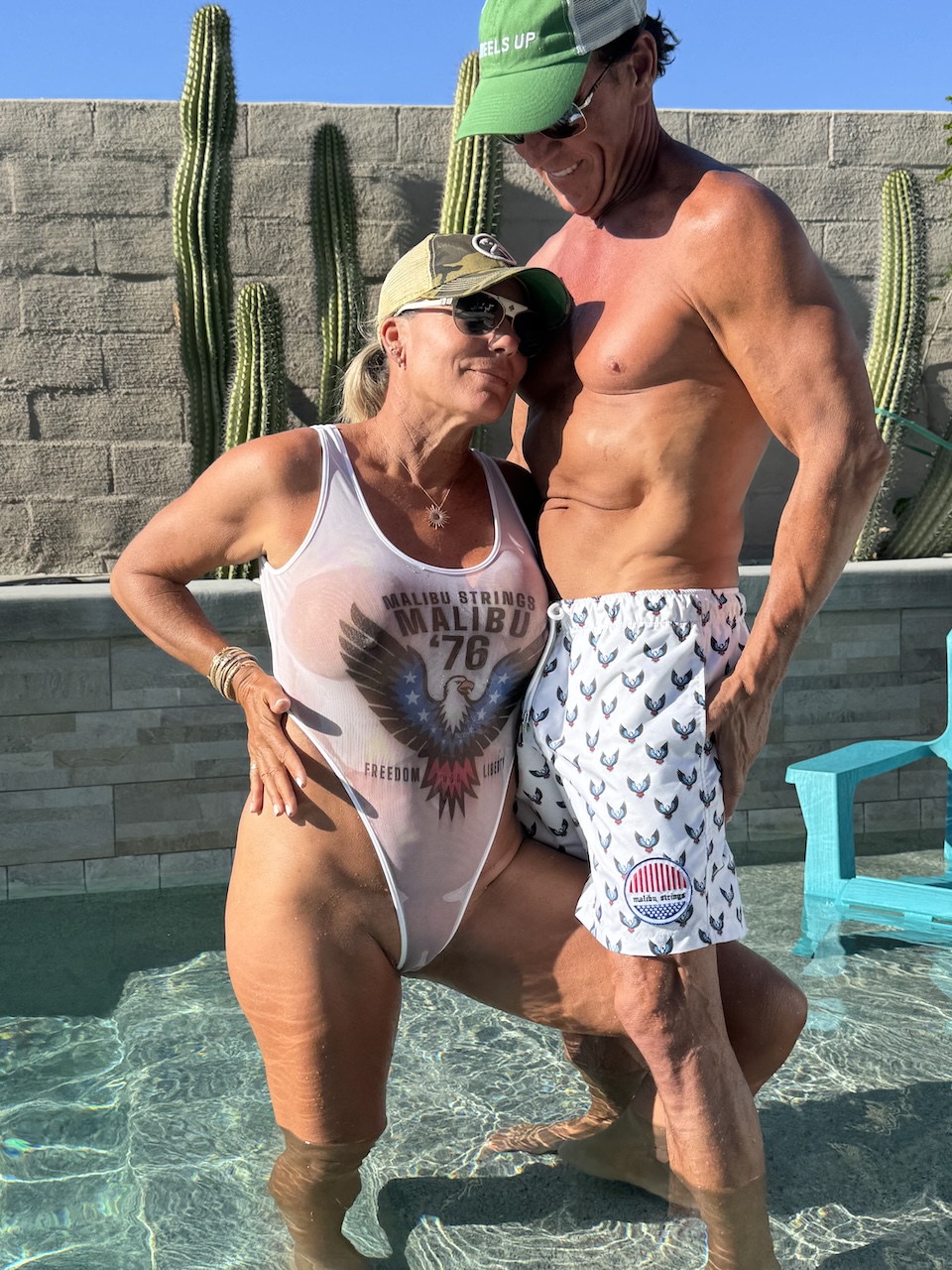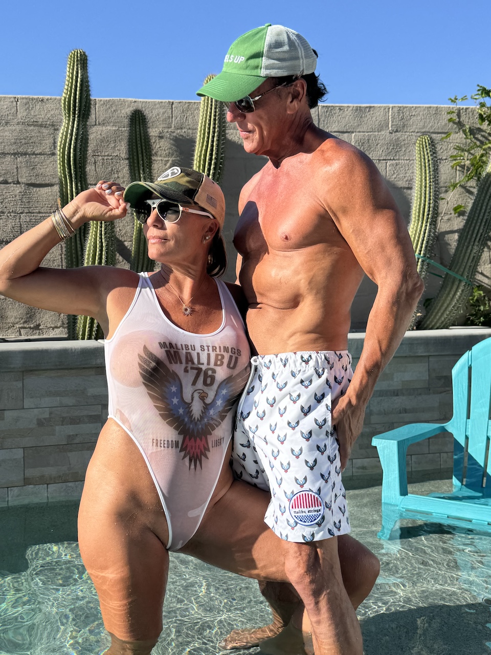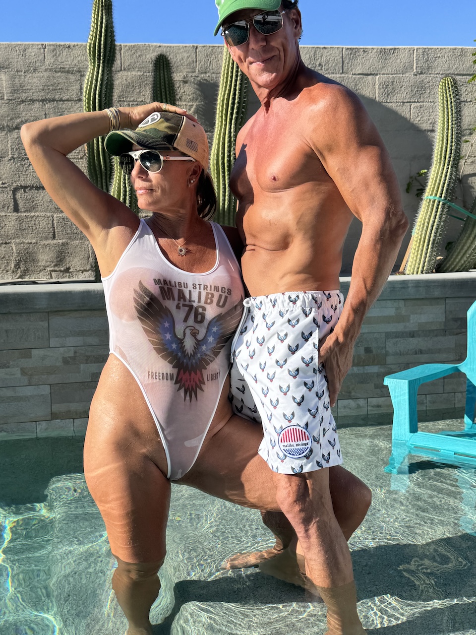 I slipped into the sheer Kona Mesh—so light it feels like air, catching just enough sunlight to hint at what’s underneath. The pool was ours for the afternoon, quiet except for the water and a little laughter drifting between my very good-looking partner and me in crime… who, by the way, wears Malibu Strings Men’s Swim Shorts very well.