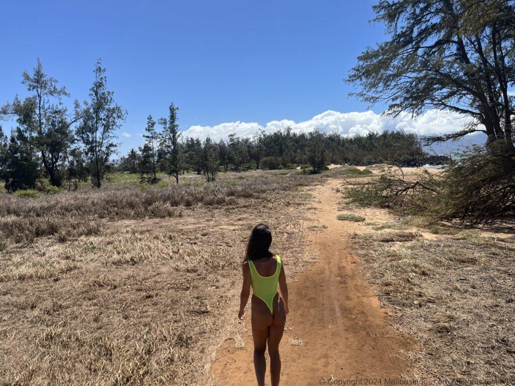 A windy beach day made for some wild hair and wilder MS suit fun! The wind started kicking up the sand though so we went for a hike, saw some sea turtles, and flashed the highway. My amazing neon one-piece was perfect for all these activities, as I hope you agree!